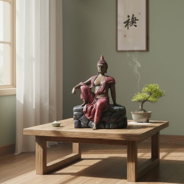 Unique Resting Buddha Statue – Pink/Red Robe Relaxing Gautam Buddha Idol on Rock Base for Home Decor, Garden, & Artistic Showpiece